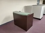 The client had limited space near the front door, so she worked out a few small reception desk ideas – eventually deciding on a 4’ wide reception desk with glass top transaction-counter.