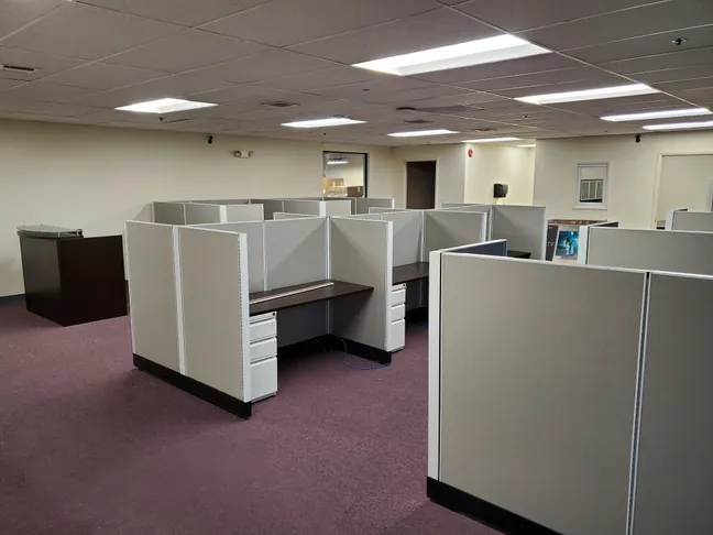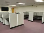 First, the office workstations: The O2-Now cubicle system ticked all 3 of their boxes. The office layout accommodates 6 small straight desk cubicles and 6 larger L shaped cubicle desk configurations. All cubicle partition panels are 53”H with integrated cubicles power in the panel bases.
