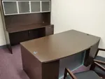 Then, the casegoods furniture: Napa laminate desks and matching reception stations really couldn’t be any faster or less expensive if they tried! In the managing director’s office Angelina’s office plan included an executive desk set with credenza and hutch, 2 wooden office guest chairs with arms, a black leather office couch, and a 2 drawer lateral file cabinet.