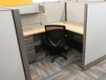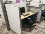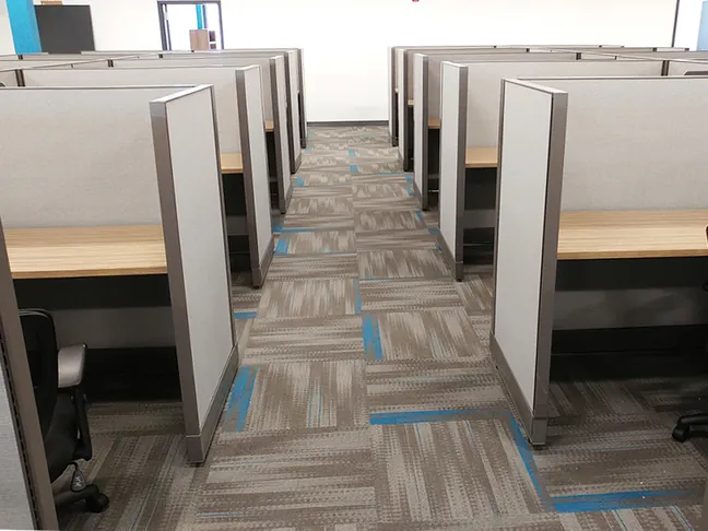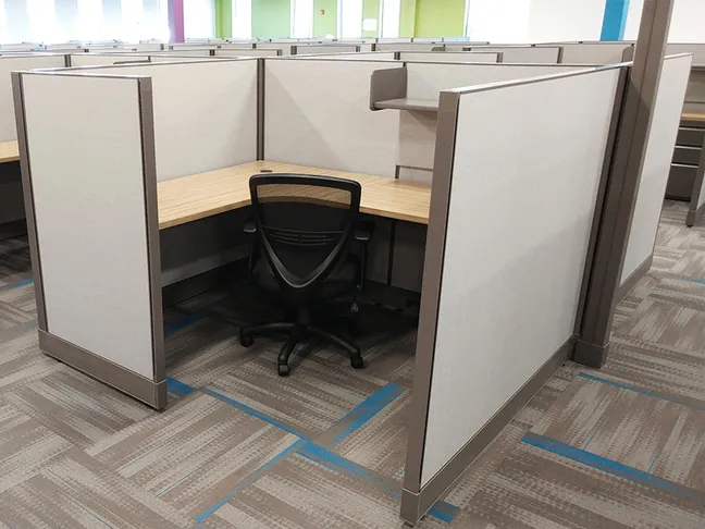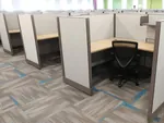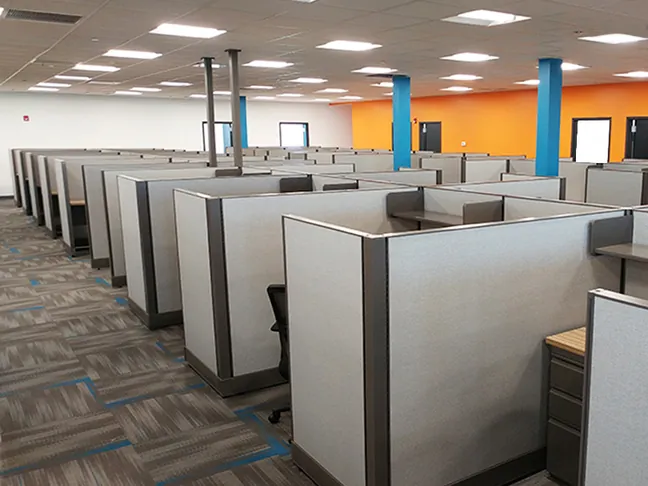 This office furnishings project follows the same interior design standards that we’ve done with many locations for Centers in the past: O2 Corporate Office Furniture cubicles with neutral fabric, dark trim, and warm woodgrain laminate work surfaces. These finish standards always sit nicely with the accent walls and flooring carpet tiles that pop with bold colors.