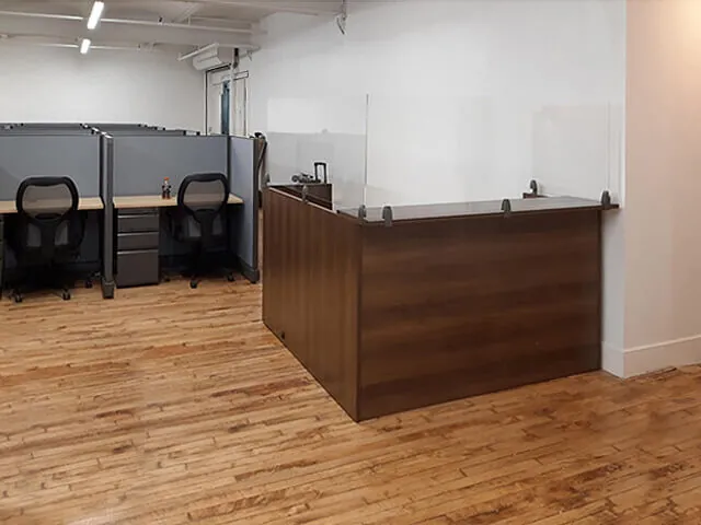The reception desk and the office suites straight desks share the Park Walnut wood finish which nicely grounds them to the wooden floor.