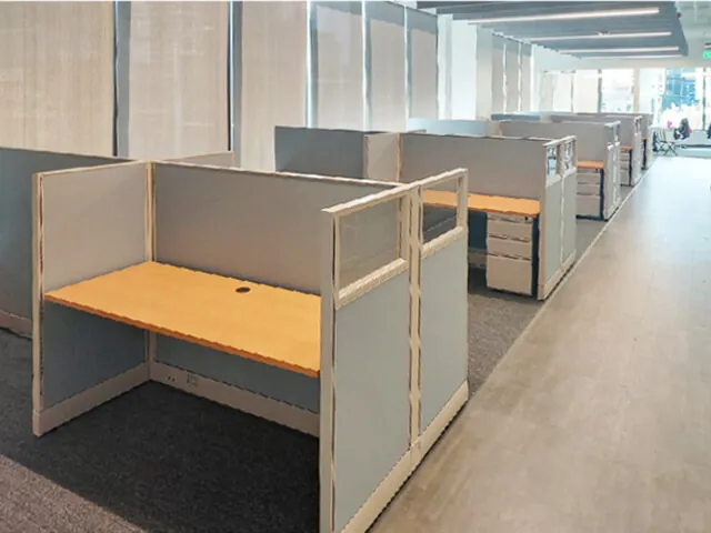 The client approached our team of office space planners to design a layout of 18 call center cubicles for their office space in Seattle. We specified a suitable height for the cubicle walls that provides a good amount of privacy when sitting down and facilitates fluent interaction between colleagues while standing up. The cubicle walls with window panels invite light to flow freely into the workstations, keeping the space feeling light and airy.