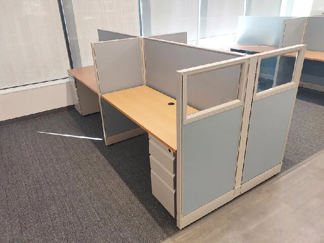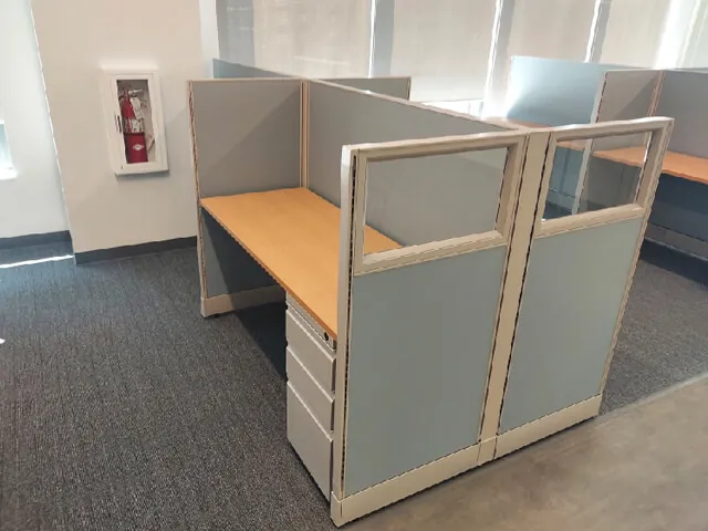 The client opted for soft powder blue cubicle panels and warm wood tones for the cubicles office desks that matched their existing office color palette seamlessly.