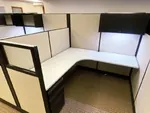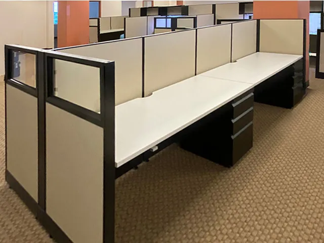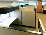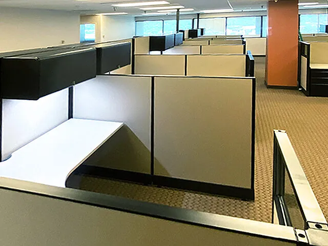 The 67”H office privacy panels were placed between the cubicle desks, creating a tall spine down the clusters to provide sufficient privacy between stations as well as the necessary height to hang the office overhead storage bins. The remaining panels were specified to be slightly lower to promote collaboration between employees and a combination of fabric and glass office partitions were used in the corridors. Three office power poles power the workstation clusters in this open office design.