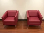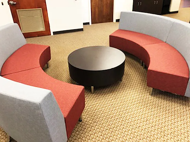 We created a collaboration workspace in the center of the office by introducing a showstopper soft bench seating system with a 36 in round coffee table that not only match their corporate colors, but also echoes the spherical elements in their logo design. We perpetuated the warm red and orange office accents in the client lounge seating with some guest chairs that are as comfortable as they are vibrant.