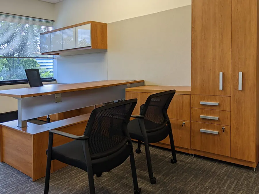 Each space was furnished with a rich wood veneer desk and a matching 2 drawer lateral file, a modern office credenza, glass door overhead storage unit, an office tack board, and a wardrobe with cabinet and pedestal.