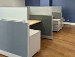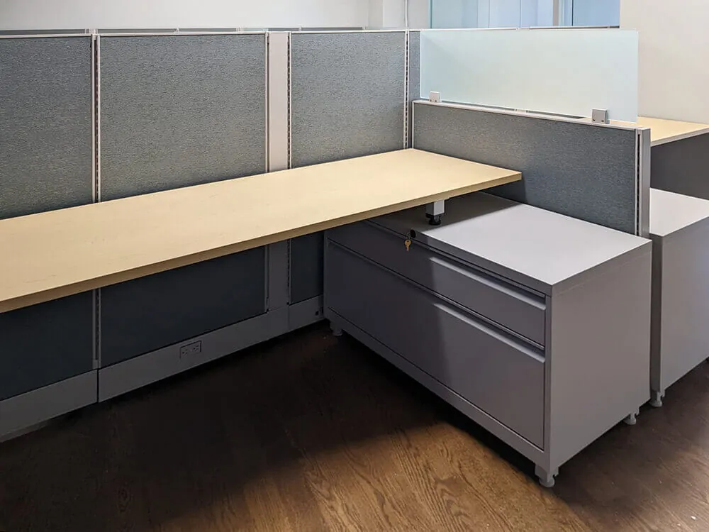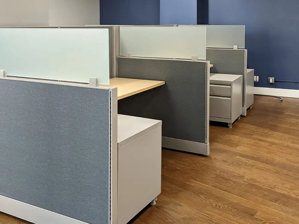 In the open office area we installed 8 office cubicle desks with mixed height cubicle panels. The back panels are 53’’ high, enabling possible future customization with accessories such as an office tack board or an office cubicle shelf. The lateral wall is 39’’ high with a 14’’ glass screen stacker that functions as a physical barrier that allows light to filter into the space, while adding a sophisticated touch to the cubicle workstation.