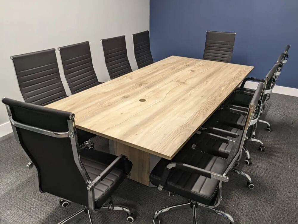 We equipped their office meeting room with an 8 person conference table and luxury meeting room chairs. The warm wood desk creates a beautiful contrast against the grey carpets and blue office wall, producing a balanced and elegant conference room.