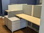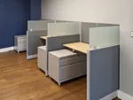 The desktop is a straight desk supported by the cubicle panel at the back, and by a low metal storage unit with drawers in front. This configuration gives this cubicle layout a light and modern look.