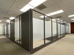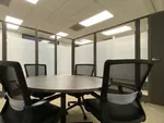 Adjacent to the cubicle space, we designed a compact yet functional conference room for four. Using the same modular office wall system, we enclosed the meeting area to provide a dedicated space for collaboration. The conference space was furnished with a round meeting table and four guest chairs, creating an inviting yet professional atmosphere. To maintain a sense of openness while ensuring discretion, we applied office window privacy film to both the new and existing glass office panels, achieving a frosted-glass effect that allows for light transmission while reducing distractions.