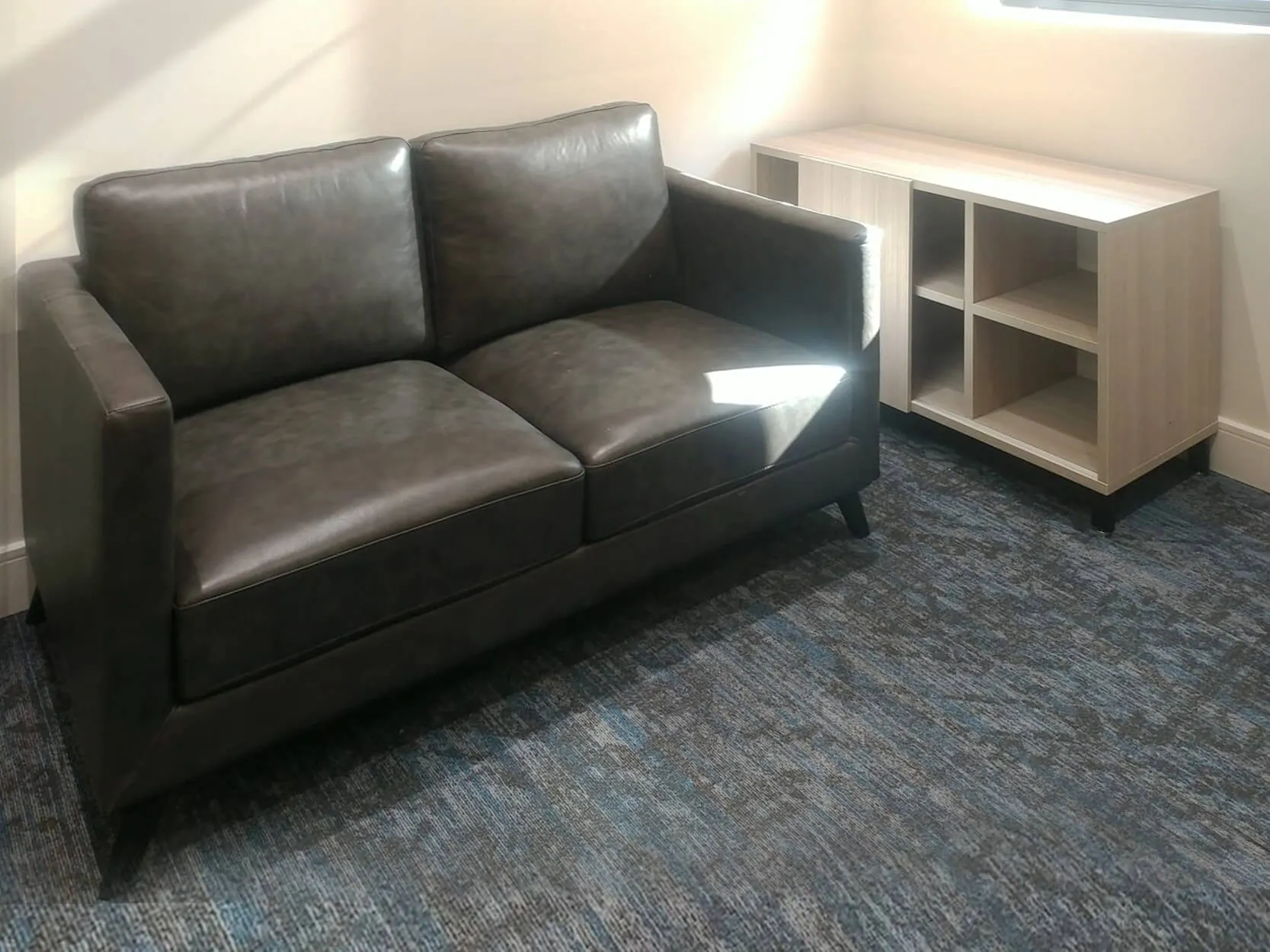 Adding a touch of relaxation and style, the office lounge area features two fabric accent armchairs, creating a cozy spot for informal discussions or downtime.
