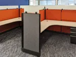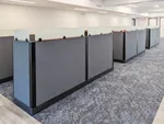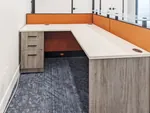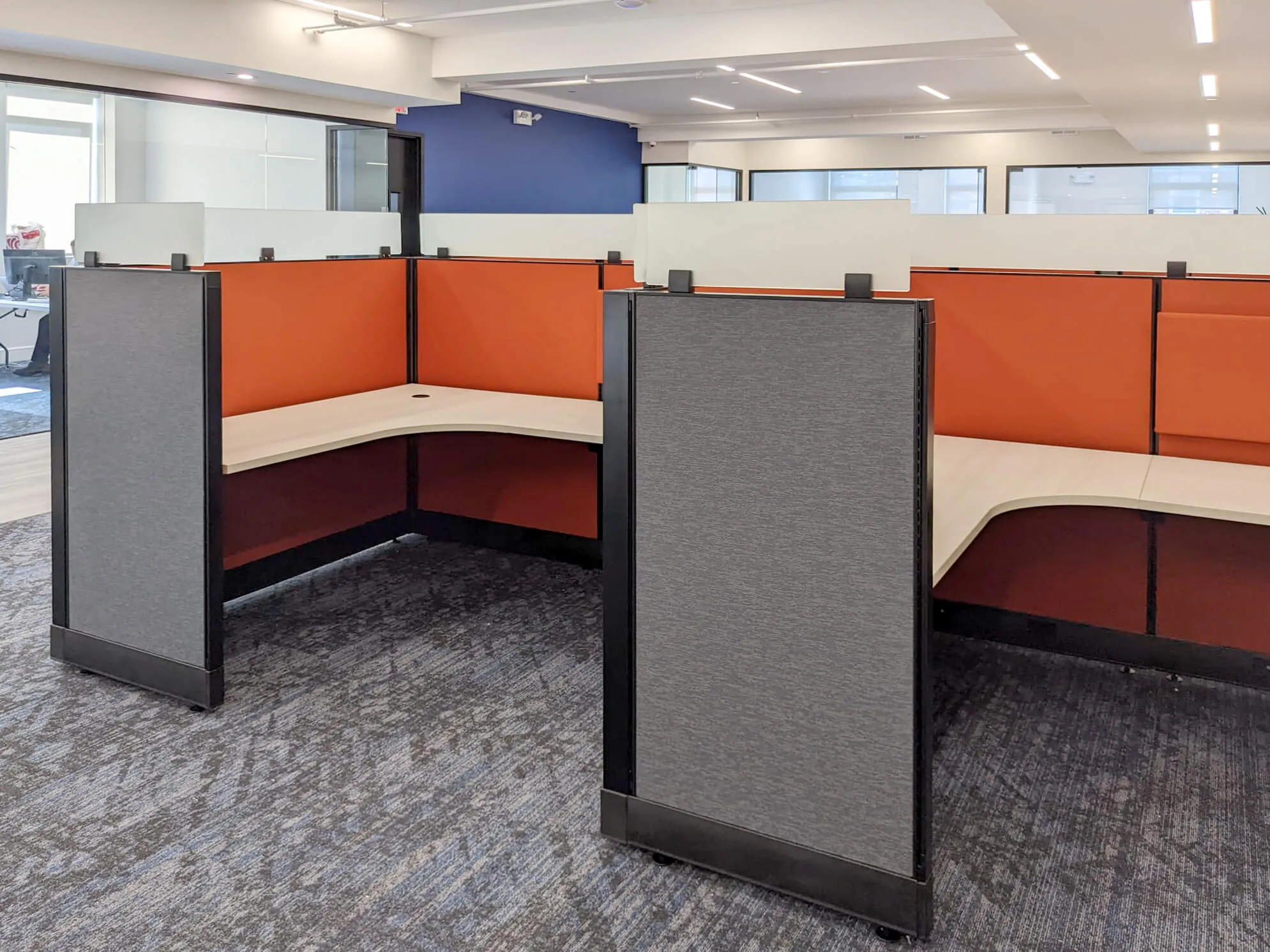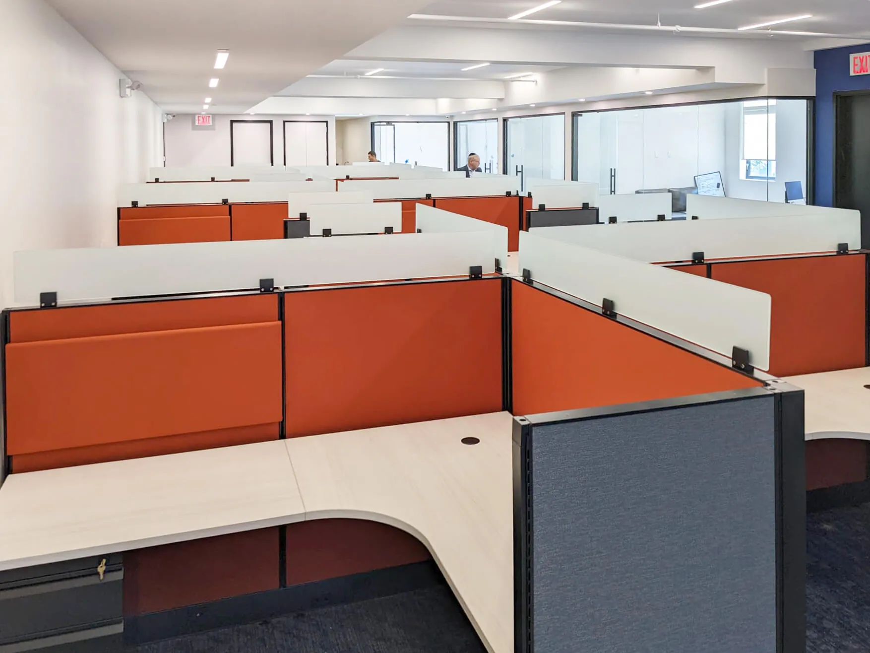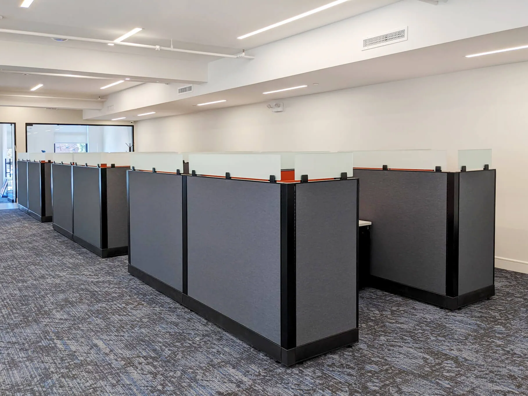 In the open office area we installed 12 cubicle workstations from our O2 Series of Corporate Office Furniture with laminate panels, all powered to support a dynamic workflow. Each cubicle desk was teamed with a box box file pedestal, an office tack board, and frosted glass panels mounted with 8-inch high screens for a polished and semi-private environment. The workstations were also equipped with ergonomic mesh chairs to ensure comfort and productivity.