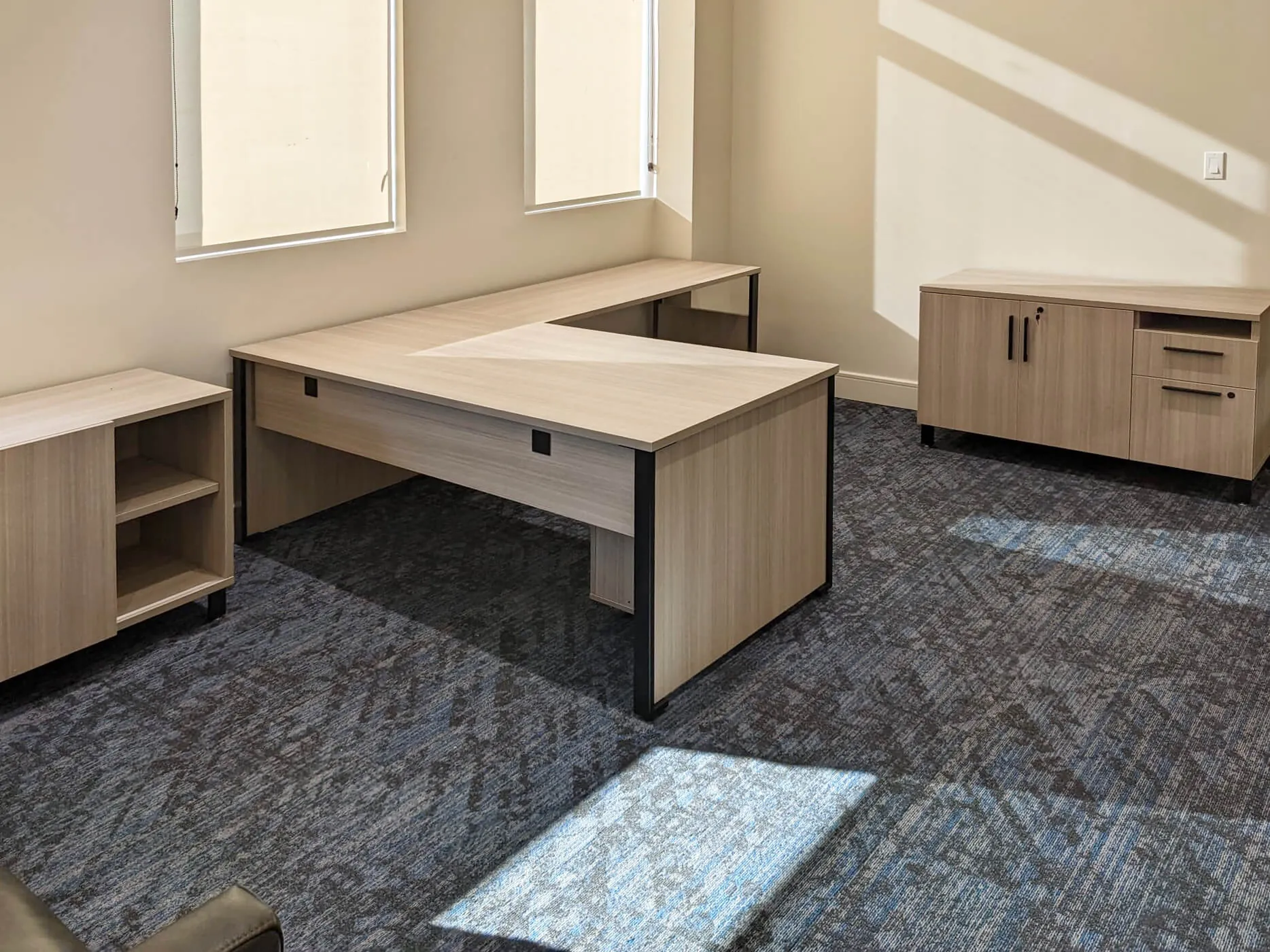 Six private offices were outfitted with quality office furniture, each tailored to meet the functional needs of their occupants. Configurations include L- and U shaped office desks with laminate modesty panels and mobile pedestals, mesh or high back leather chairs for comfort, and storage solutions for office use, like credenzas and bookshelves.