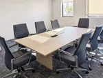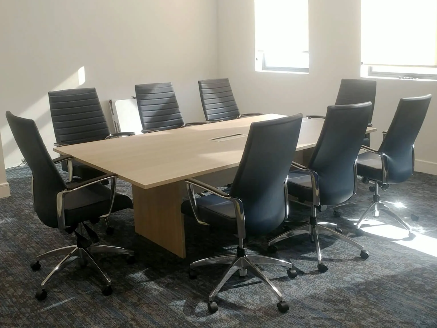 The centerpiece of the meeting office space is a powered modern conference table paired with eight high back executive chairs, offering a sophisticated contemporary conference room design for collaboration and meetings.