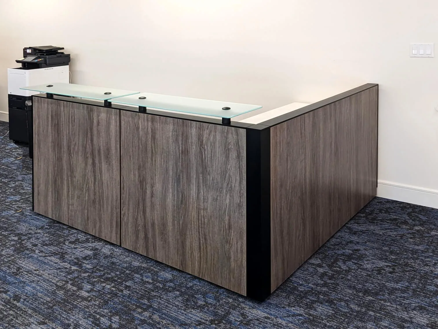 The corporate reception space sets the tone with a powered 5x6 modern office reception desk featuring a frosted glass transaction top. A comfortable mesh back chair complements the clean and welcoming design, creating a striking first impression.