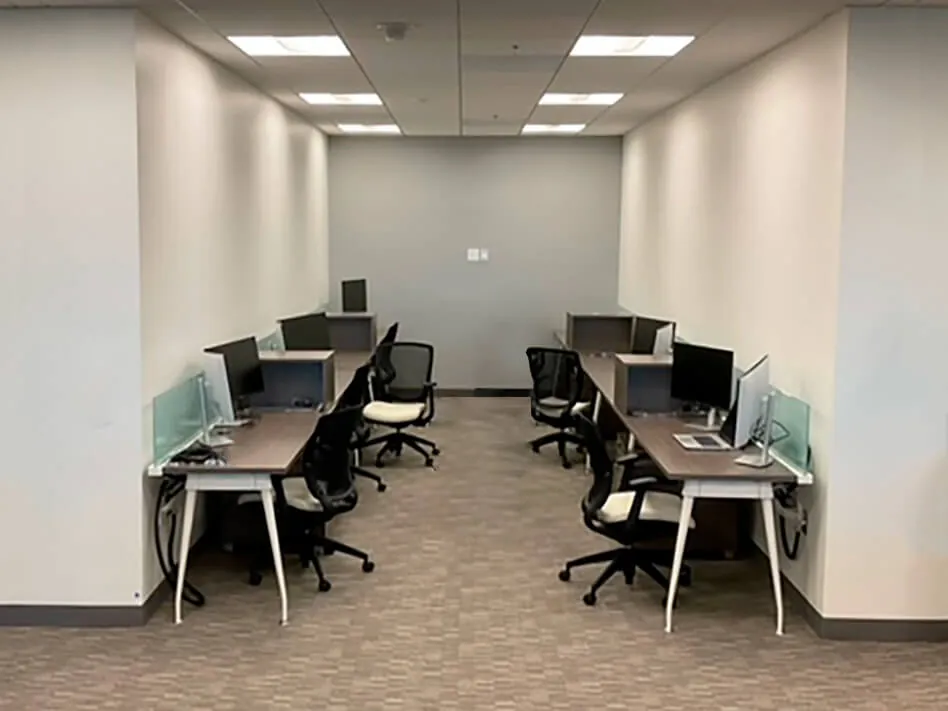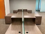 In Open Area #1, we installed eight L-shaped workstations, each measuring 72”W x 60”D x 29.5”H. To ensure both openness and a certain amount of privacy, each station was equipped with a 12”H frosted glass screen serving as a desk divider. For efficient office storage, we added a box box file and file file pedestal configuration to each desk, as well as a mini hutch to maximize organization. Each office workstation was completed with an ergonomic task chair, ensuring all employees have a comfortable and productive work environment.