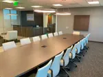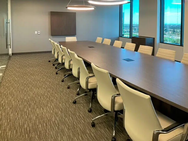 For the office conference room, we installed a striking 216”W x 60”D boat shaped boardroom table for 18, designed to accommodate large meetings and collaborative discussions. This stylish boardroom table with power boxes was chosen for its capability to ensure seamless connectivity with multiple digital devices. The setup was complemented by a 40”W x 48”H presentation cabinet and a 36”W x 18”D x 36”H buffet credenza for additional functionality. To complete the professional setting, 18 high-quality conference room chairs were provided, ensuring both comfort and elegance.