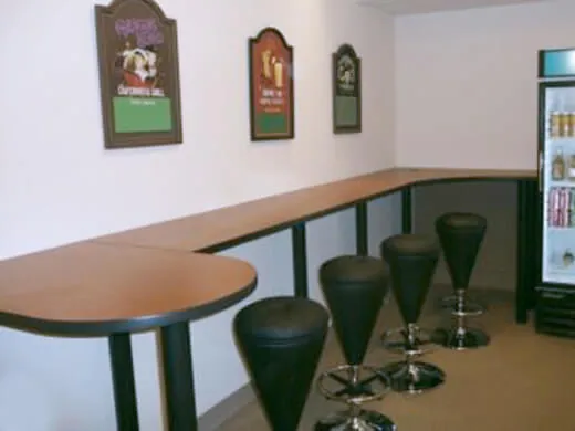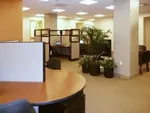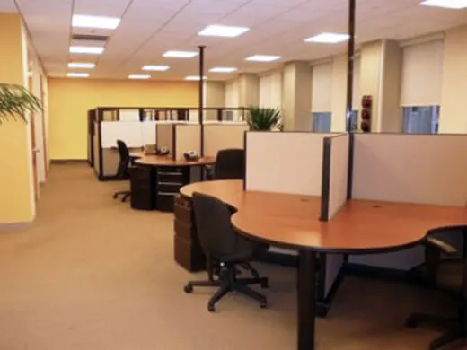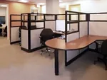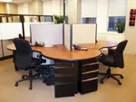 New office furniture includes 6x6 cubicles with L-shaped work desks, and 5x5 stations in a clover cubicle configuration from our O2 Corporate Cubicles. We specified conference room chairs and tables, and a custom bar table top with black and chrome barstools in the breakroom.