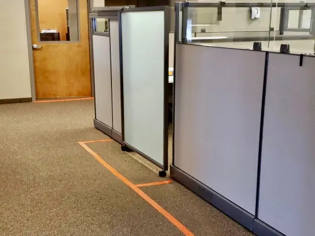 First, we replaced the panel partitions along the common aisleways and at each cubicle entry with taller, wider office panels and strategically placed cubicle windows where visual contact was still necessary. Then we added a 36”W sliding cubicle door to create an enclosed work pod and added social distancing floor graphics for each entry point.