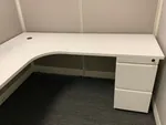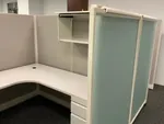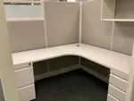 We specified our O2™ office cubicle with doors in a cluster of two L- shaped workstations. They feature overhead storage bins, a box box file pedestal, and a file file pedestal, ideal to keep the workspace clutter-free. These cubicle workstations also feature a desk grommet for cables and a desk hole cover to deliver a tidy form of cable management.