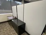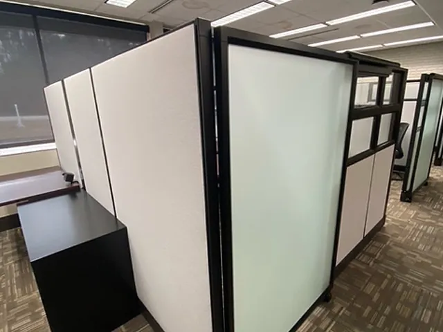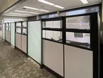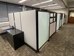 These private cubicle offices were placed against a line of windows and designed with glass panels and frosted glass cubicle doors to allow natural light to flow into the office and were paired with mesh-backed task chairs as well as black guest chairs.