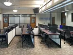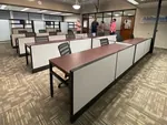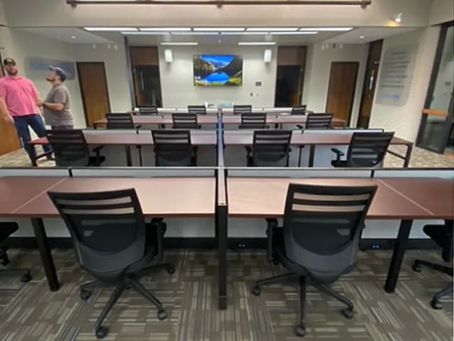 Our office space planners designed a comfortable layout for 16 office training tables. We used our 39” modular cubicle panels constructively to double up as a structural element for the training tables, as well modesty panels for the seated trainees.