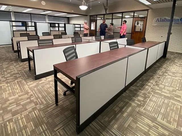 Alabama One contacted us to furnish a portion of their interior spaces in their office space in Alabama. This time, our loyal returning client had a need for a large training area to conduct training sessions, and three additional private offices.