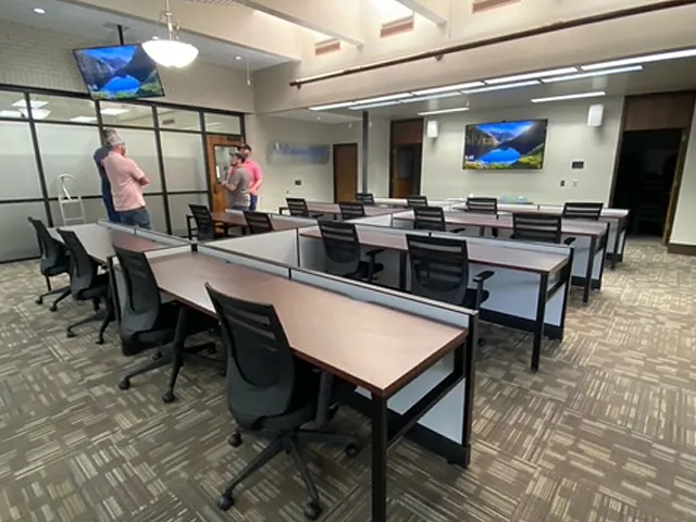 Each training workstation was provided an ergonomic mesh task chair with pneumatic seat height adjustment and height adjustable arms. Employee comfort is key when it comes to lengthy in-house training sessions.
