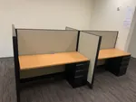 These workstations offer versatile office storage solutions, and in this particular setup we introduced a box box file pedestal in each station. An adjustable keyboard tray, tackboard panels, cubicle shelves, led task lights, and overhead storage bins can all be added as cubicle desk accessories to complement each workstation and enhance the experience.