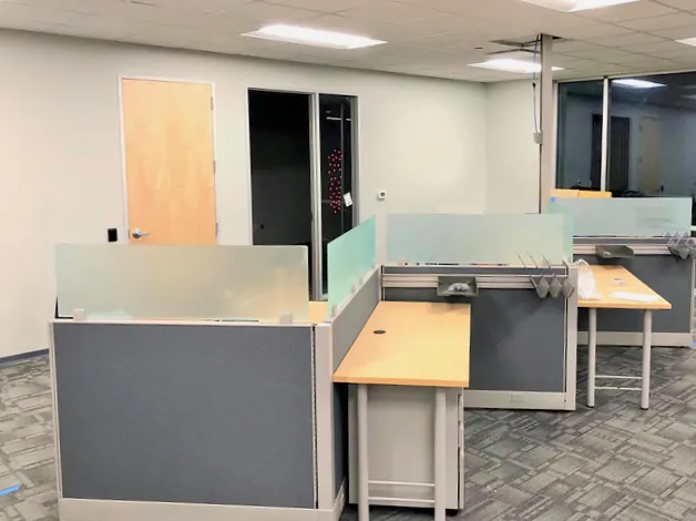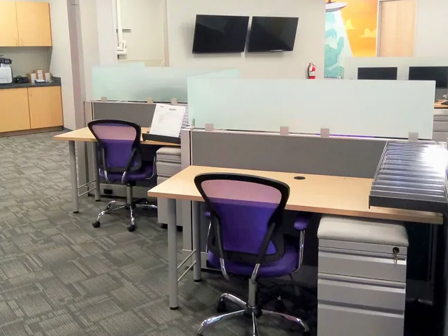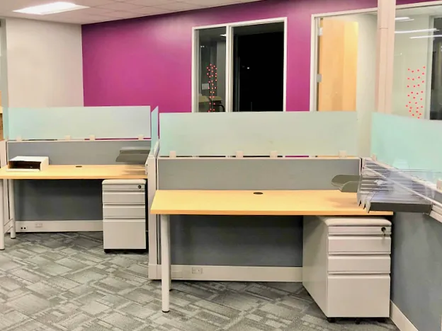 We had a lot of fun with office colors on this project. Soft grey cubicle partitions and office carpet squares provide the calm anchor that allows Wayfair’s corporate color palette to really pop with gold and plum accent walls and fun purple office chairs. The light maple laminate desktops match the office doors and create a unified cohesiveness between the office interior and office furniture finishes.