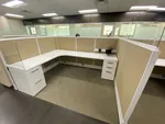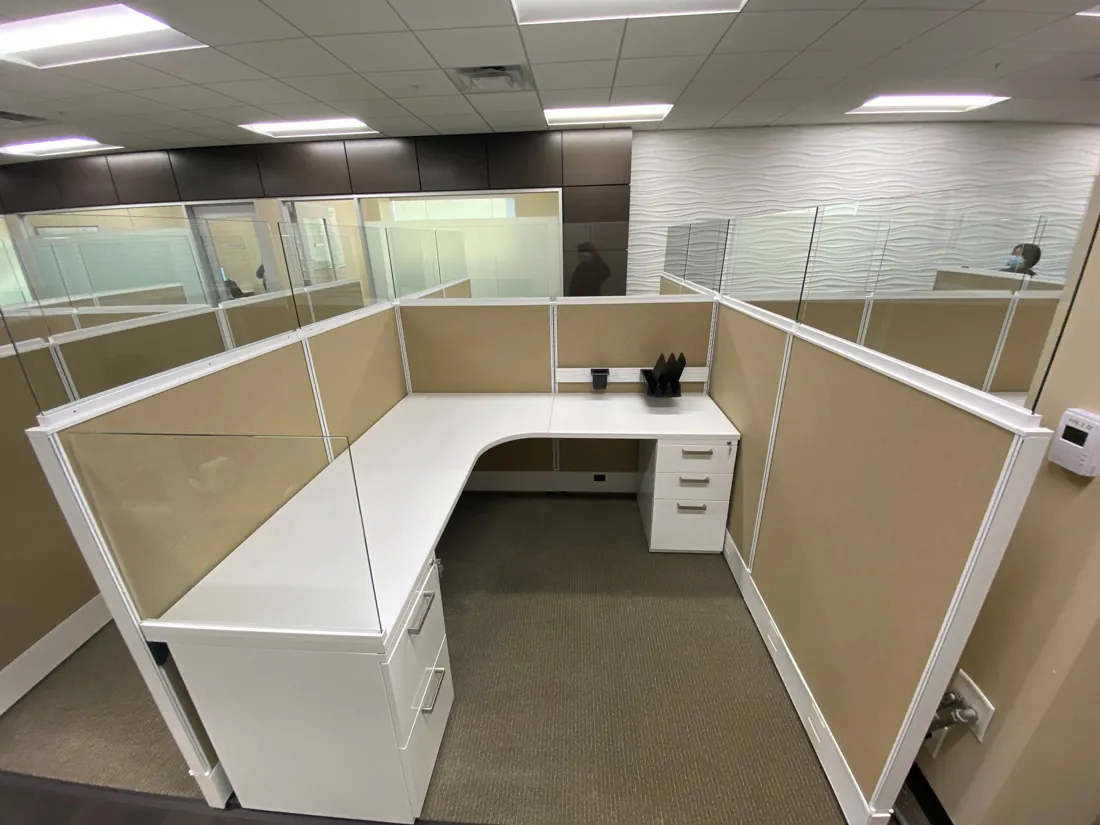 For aesthetically pleasing office colors the L-shaped workstations have crisp white desk tops, white filing pedestals, and a white tool rail bar with paper tray and pencil holder. The cubicle fabric is a warm shade of wheat.