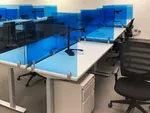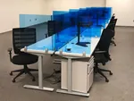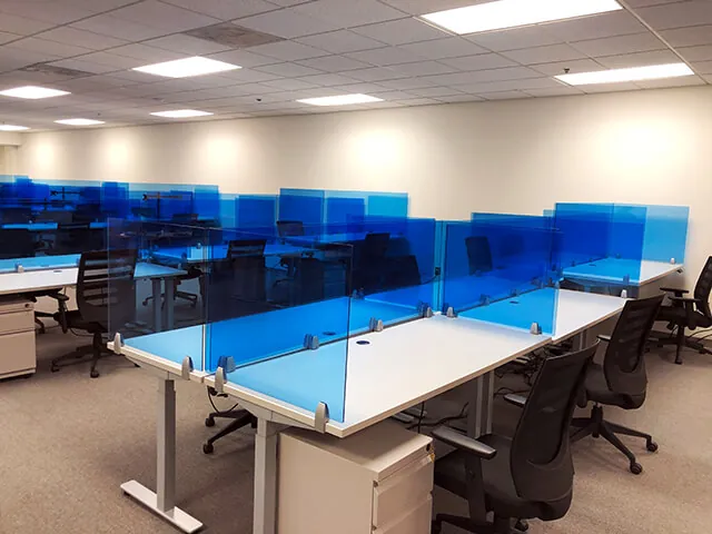 We created their office layout with thirty 72”x30” and fifty 60”x24” sit and stand computer desks. For a bright, cool office style they have white laminate desk tops, silver metallic sit stand desk bases, and custom blue acrylic desk shields to match their corporate color. These double as office sneeze guards, an important post-pandemic office accessory!