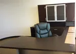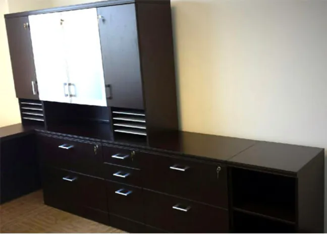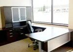 In the private offices, sunshine from giant windows beams across U shaped executive desks with returns and state of the art office storage cabinets. The glass office cabinet doors and brushed aluminum handles add a sense of glitz to the rich woodgrain executive office furniture.