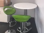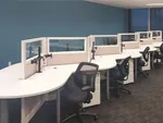 Aiming to maximize work collaboration, we specified our sharp looking Optima V office benching system in a zig zag layout with curved desktops and 39” low cubicle walls. Their signature lime green corporate color accents the filing cabinets with cushions and bar stools in the breakout area, which pops against the crisp canvas of otherwise creamy white office furniture.