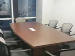 The private offices have simple L-shaped office desks with pedestals and overhead storage cabinets. The desks and boat shaped 8-seater conference room tables have a chic Tiger Walnut laminate finish that balances the lively colors of the open plan office layout with a sense of sophistication.