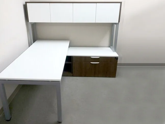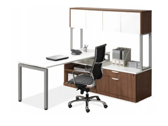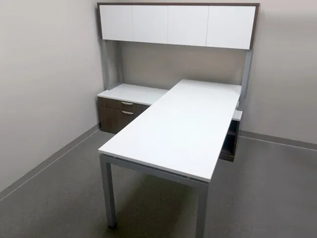 The client met with our office interior designer to update their corporate offices with contemporary business furniture. They were interested in office furniture designs that included modern elements like a floating top desk, a sleek and sharp profile, and low storage. They really loved the look of Hon Voi L-shaped workstations, but wanted to keep the project within a smaller budget. They were delighted when we showed them a “lookalike” business desk line from OfficeSource that was not only about 20% less, but also in stock and ready to ship!