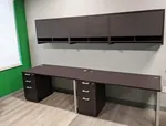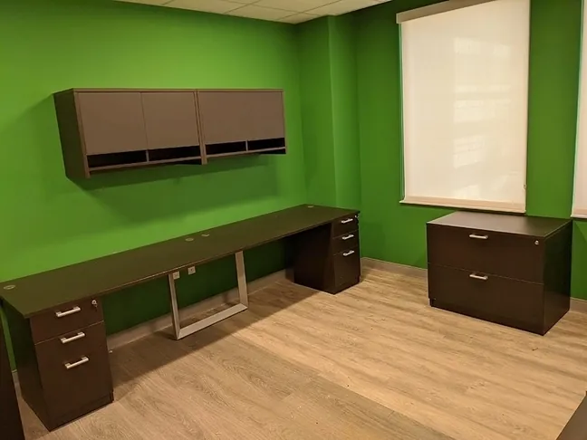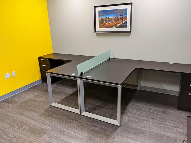 Other offices within the space were for departments that require more daily interactions in their workflow. In these areas we specified open office desks from the Compel Pivit line in dark espresso finishes with silver accents that really popped against the vibrant green and yellow accent wall colors and guest chairs. Frosted glass desktop dividers added an extra touch of class.