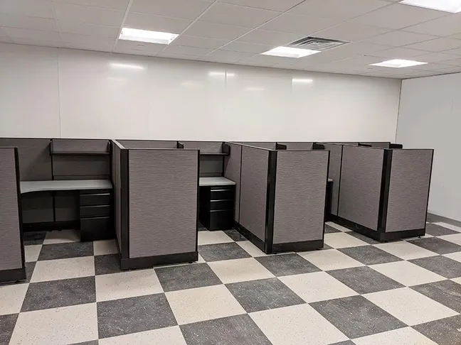 Each room required a slightly different approach to meet the departmental needs. The four people in the food services office work very independently and require separate, private workspaces that allow them to perform focused solo work. So we specified (4) 5x5 cubicles from our O2 Corporate Office Furniture line, with thin panel bases and a monochromatic palette to create a modern, understated, and peaceful work environment.