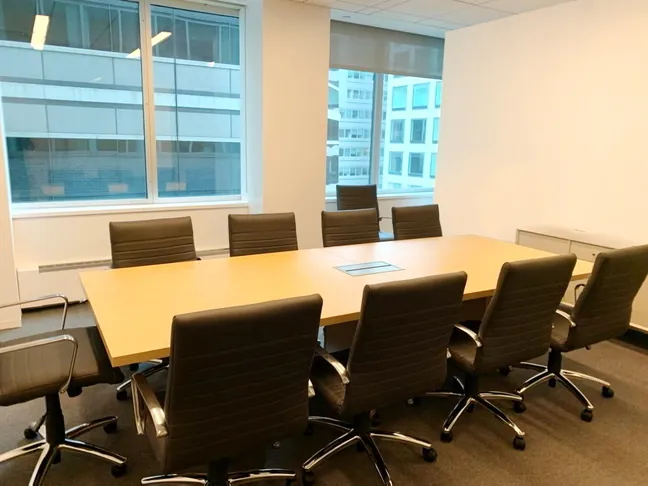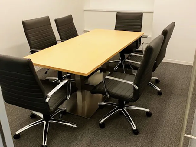 Meeting rooms have chrome & tufted leather conference chairs surrounding maple conference tables with chrome table bases. In the remaining office, we custom fit extra-long desk surfaces, legs, and under desk filing cabinets to wrap around the existing office walls, creating a great collaborative workspace for two employees.