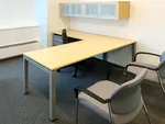 We kept things uniform in the 4 private offices and specified an executive L shaped desk with hutch finished in a combination of light maple desktop, silver metal desk legs, and a metal storage cabinet with drawers. Modern office design details include simple, angular lines, a wall mounted floating hutch, and an office “table desk” with open post table legs and no modesty panels.