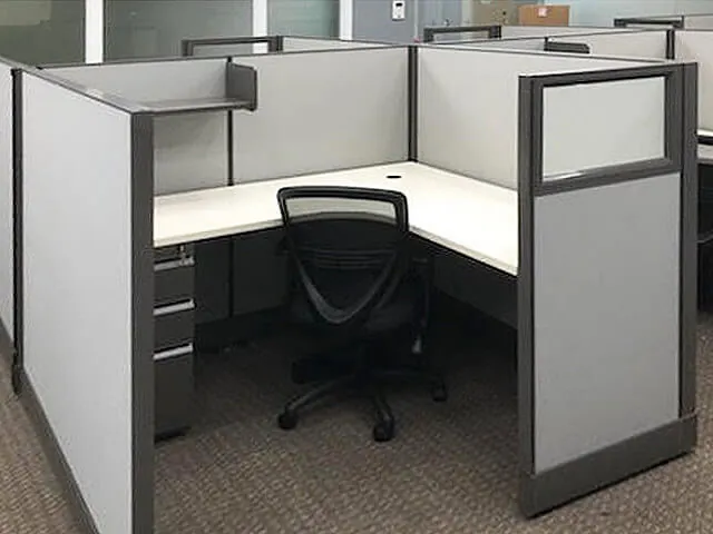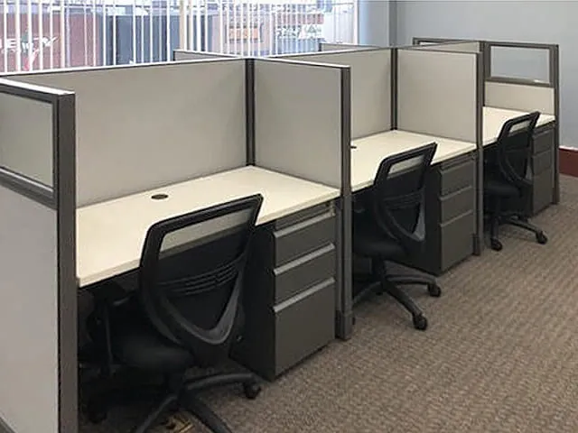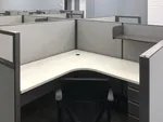 For the open office space two distinct styles of cubicle office desks were used. On the one hand, our highly compact and practical desk system, the O2 Now Hot desking with drawer pedestals. On the other, our comfortable, low partition walls with glass L-shaped cubicle desk. This model offers ample desktop surface area and was equipped with a pedestal file cabinet and shelf for storage purposes. Black ergonomic workstation chairs were provided for both types of cubicle units.