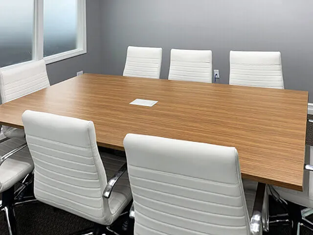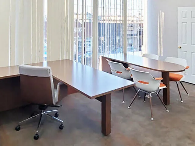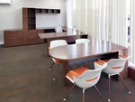 Our interior office designers opted for contemporary style in the executive office, that would extend right through to the conference room furniture, as is evident in the minimalistic rectangular conference table with power outlets.