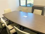 The conference room setup features a large conference table that seats eight people in opulent white conference chairs. These chairs are specially designed to promote user comfort during lengthy meetings.
