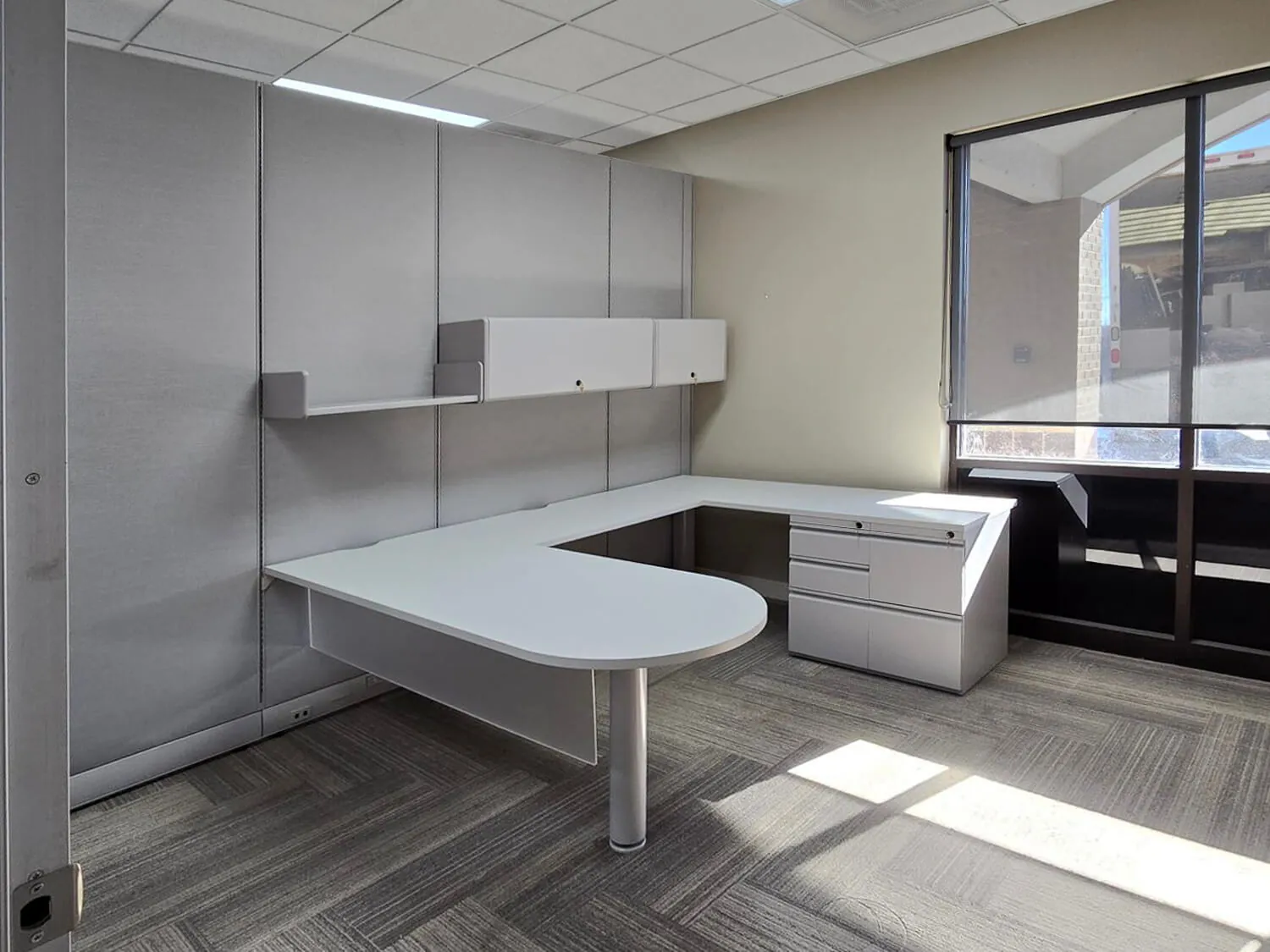 Each private office area was furnished with a U shaped office desk, offering ample workspace and a sleek, organized look. To complement the office workstations, we incorporated ergonomic task chairs for employee comfort and guest office chairs for visitors, enhancing both function and style. Additionally, we provided smart office storage solutions, including overhead storage units and a box box file pedestal, ensuring that employees have easy access to essential materials while keeping a clutter-free workspace.
