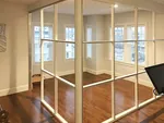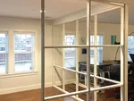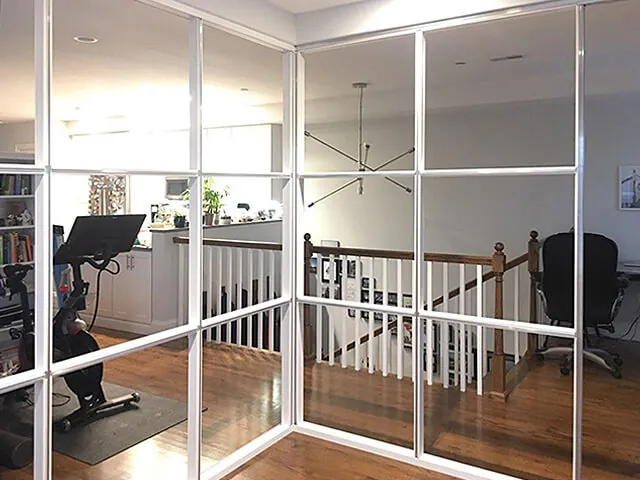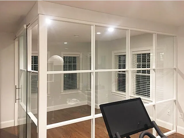 The glass wall panel frames and segmentations are powder coated milky white to match the existing environment for a seamless integration. The client was overjoyed with the final result – a modern home office space in Boston with enough separation that home life can be seen but not heard.
