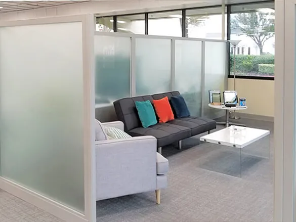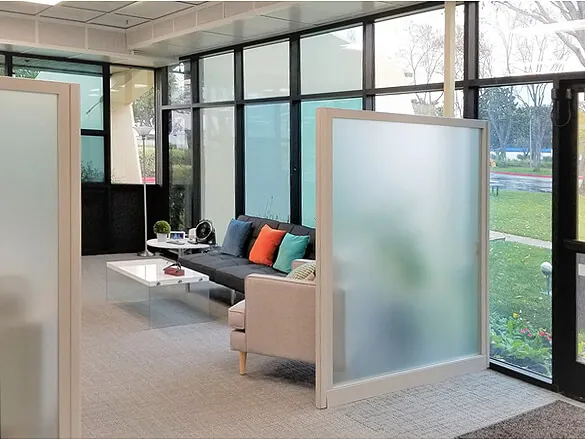 View partnered with our office interior design team to create a classy reception area in their office in Silicon Valley. Naturally, it made sense to involve glass. We chose to enclose the modern office reception seating area with frosted glass half walls.