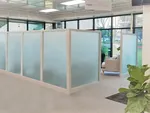 The frosted effect helps make the space feel like an intimate, private office lounge area, while the decision to make them glass half wall partitions only 6 feet high keeps the space connected to the rest of the floor in a somewhat open concept office design.