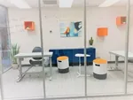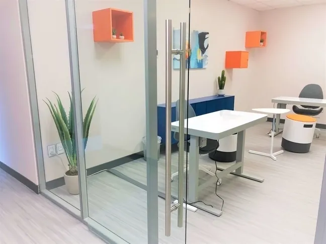 The office furnishings include electric sit stand desks and active seating, both of which encourage freedom of movement while working & creating.