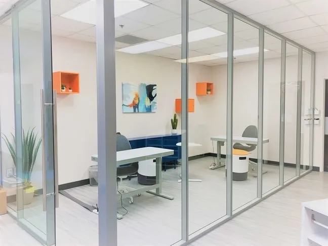 The glass wall system is 9 feet high and anchored to the drop ceiling. The glass office door glides silently on its track by pulling the 48” long non-locking bar pull handle. The daily haiku contest entries scrawled on the glass panels are wonderful.