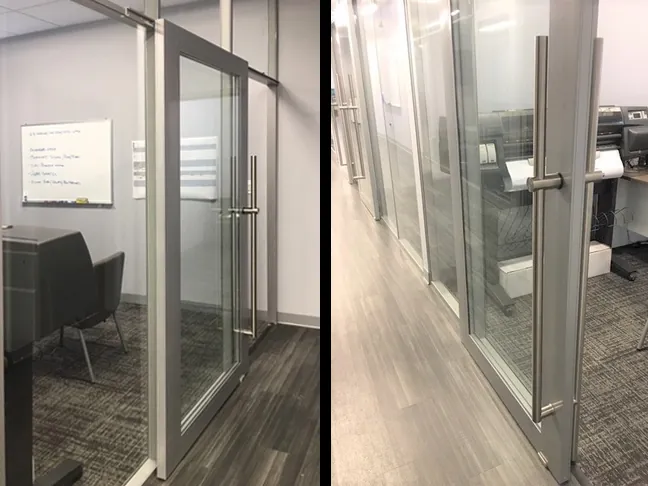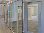 These minimally framed office glass partitions are from the Flex Series. All glass wall panels are 10' high and include both open swing & sliding glass office doors with ADA-compliant pull handles.